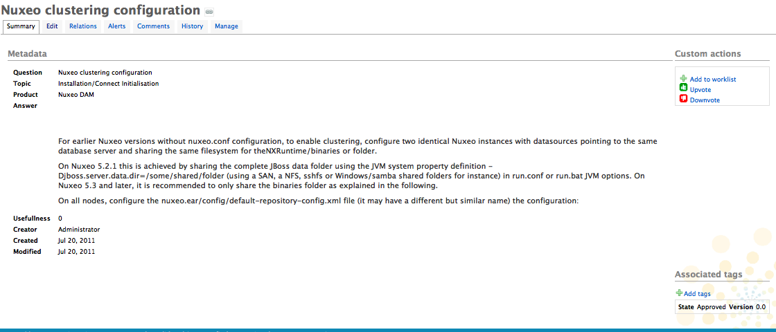 The FAQ project provides a "Question" document type, with a small publishing flow, and a FAQ container so as to display published FAQ entries in an easy to read way. It also shows how to extract an html document from all the entries. It is a nice sample of using Content Views, as well as Document Templates feature. Don't forget to restart your Nuxeo server to completely see the configuration effect.