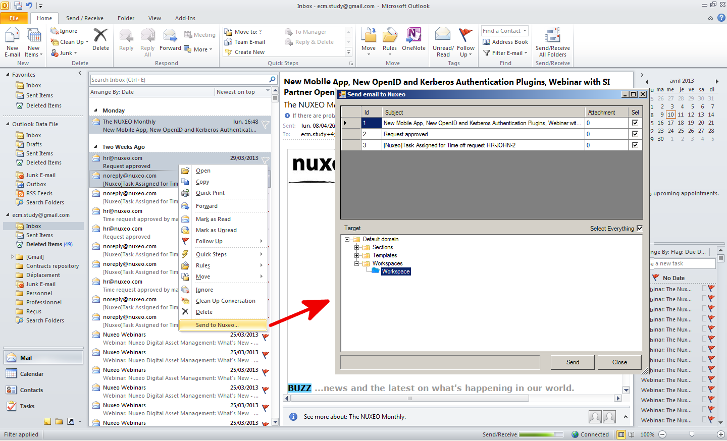 - Select one or several emails in Outlook, right-click and select "Send to Nuxeo" menu