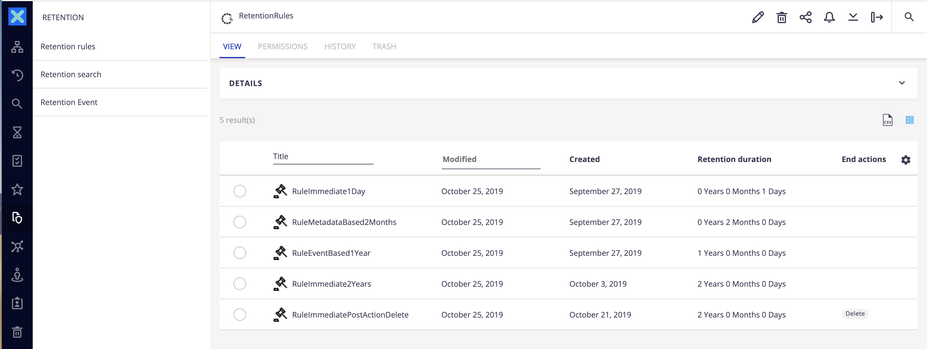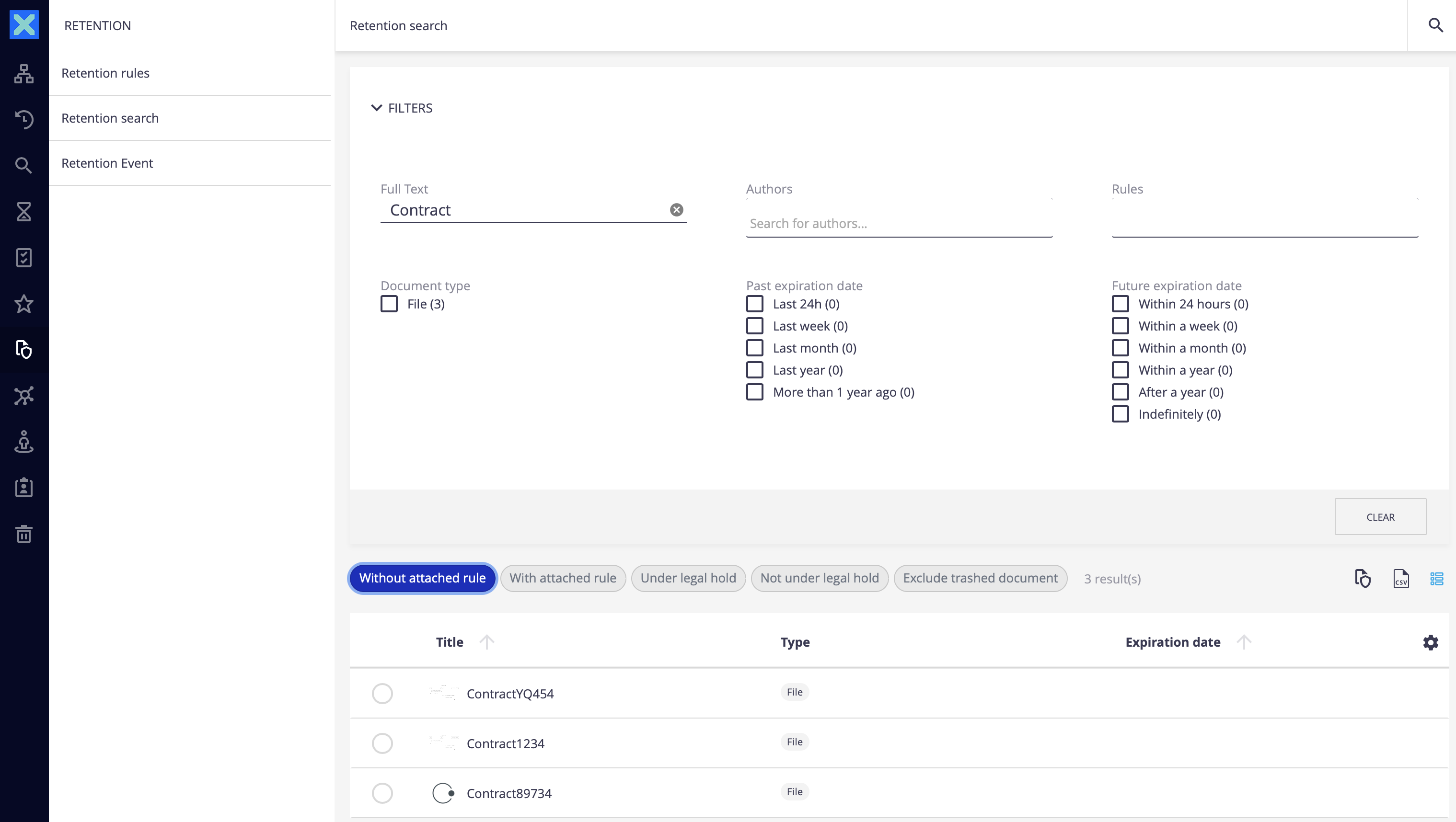 The Nuxeo Retention Management addon covers all the necessary aspects of retention management to fulfill legal requirements. It includes management of records, retention rules, deletion of the document at a specific date and legal case management features, such as putting documents under legal hold and/or retention depending on a specific event or metadata and searching for a retention rule.