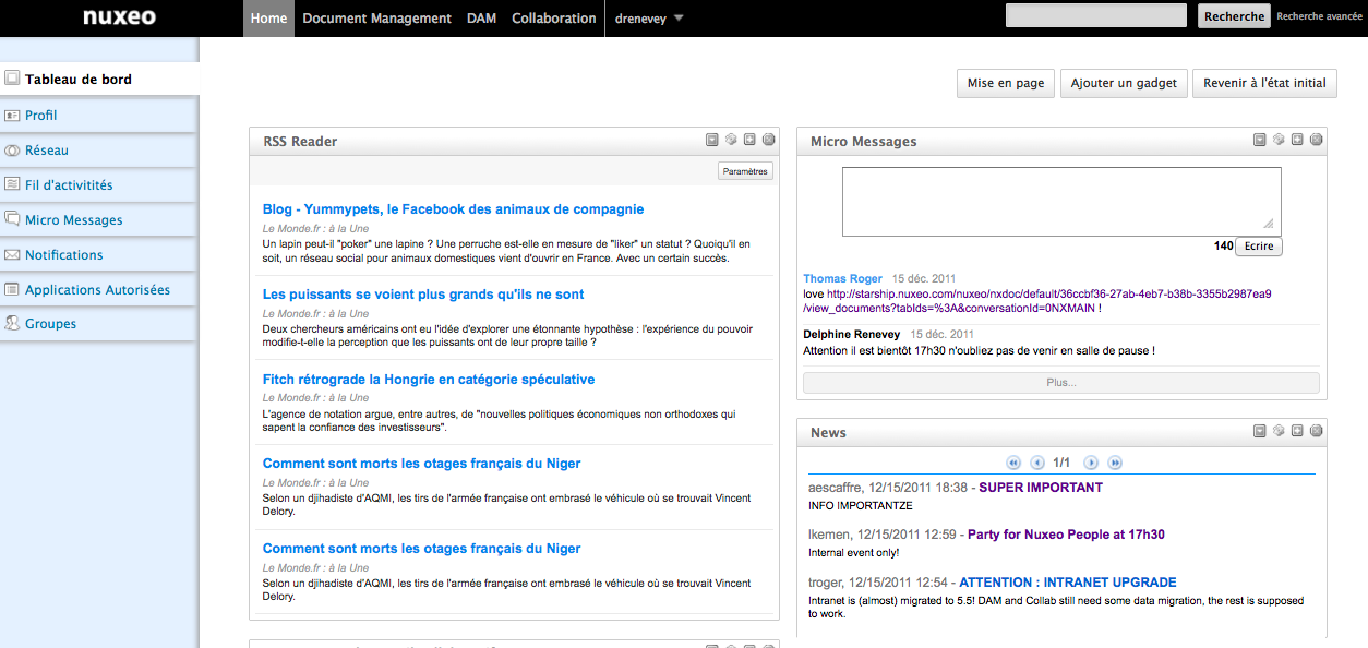 Nuxeo RSS Reader provides an OpenSocial gadget displaying RSS feeds. These feeds can be configured by the Administrator through the Admin Center and by the user himself.