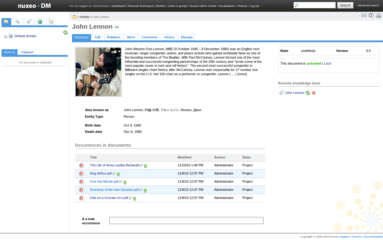 Extract and analyze the text content of Nuxeo documents by using an external Apache Stanbol server and and the knowledge base DBpedia to link documents to summary hubs for real life entities such as persons, places and organizations. This addon can be seen as a way to automatically annotate documents with semantically disambiguated tags. This addon will put a high write concurrency pressure on the database server. The test H2 database is NOT supported in production setup. IMPORTANT: The default configuration of this addon will automatically send the text content of all the newly created or modified documents to a demo Apache Stanbol server hosted by Nuxeo. You should not use the default configuration add-on on a Nuxeo repository containing confidential document. For production environments you MUST configure your own Apache Stanbol server instance. See the marketplace page for further instructions.
